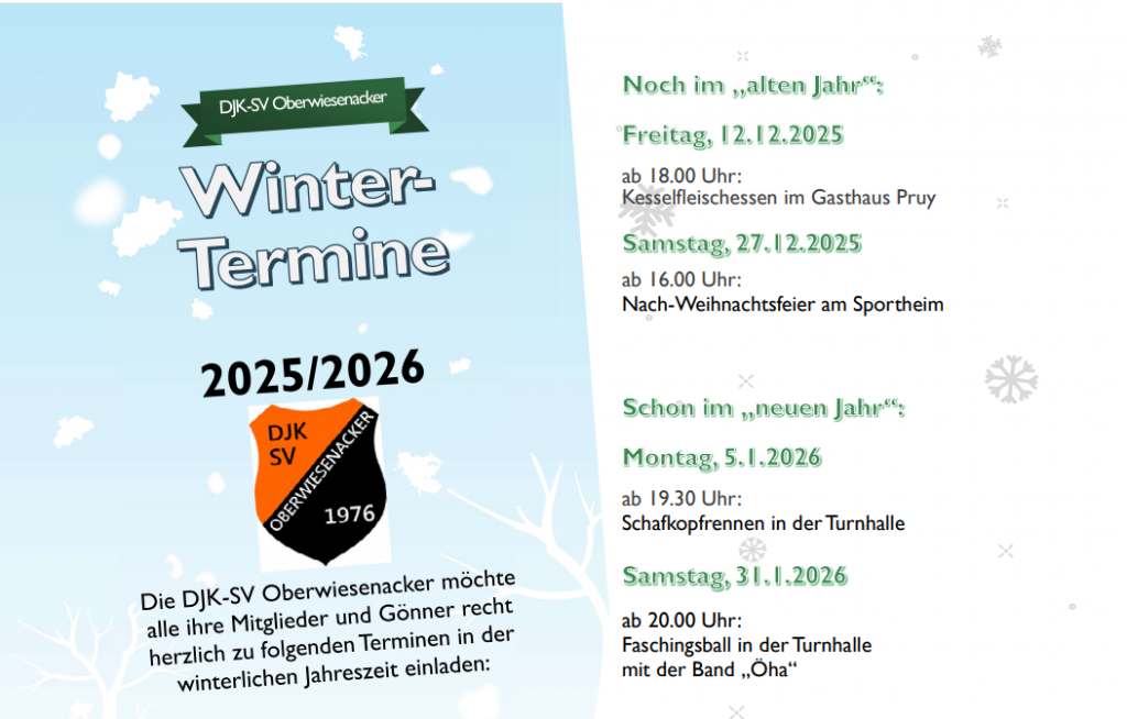 Am Montag, 05.01.2026 um 19:30 Uhr findet wieder unser traditionelles Schafkopfrennen in der Mehrzweckhalle in Oberwiesenacker statt. Die Startgebühr beträgt 12€. Gespielt wird kurzes Blatt mit Solo und Wenz.