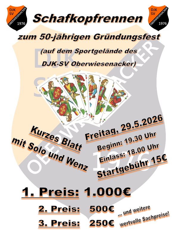 Am Freitag startet unser Jubiläumswochenende mit einem Schafkopfrennen – wir freuen uns auf zahlreiche Teilnehmer und einen geselligen Auftakt.